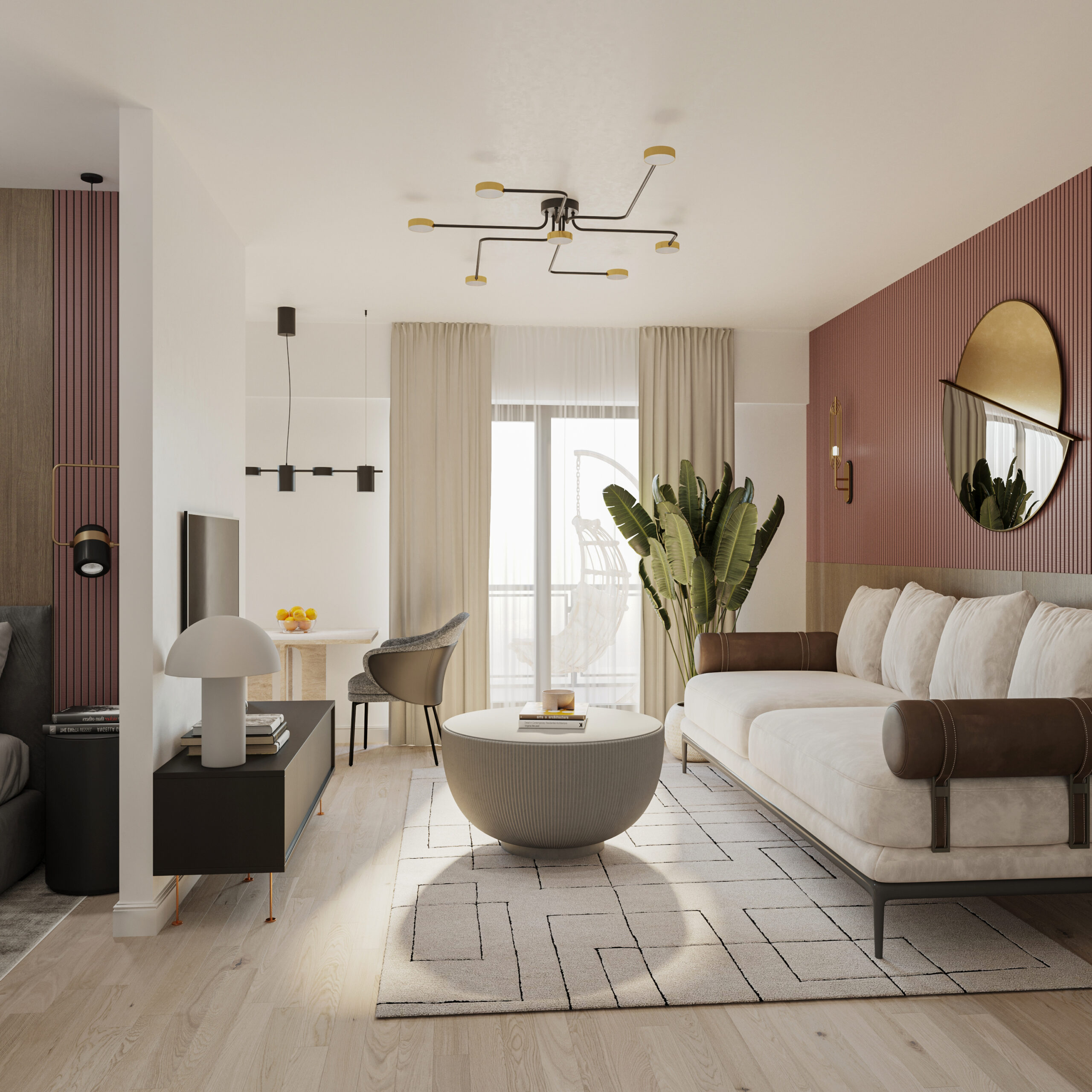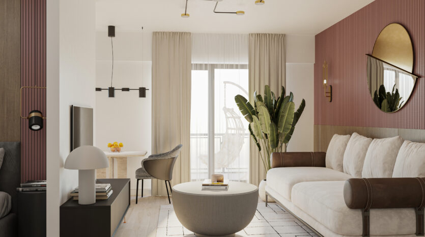 Modelul de apartament prezentat in anunt are urmatoarea configuratie: living+bucatarie+zona de dormit separata, baie, hol, dressing si balcon.